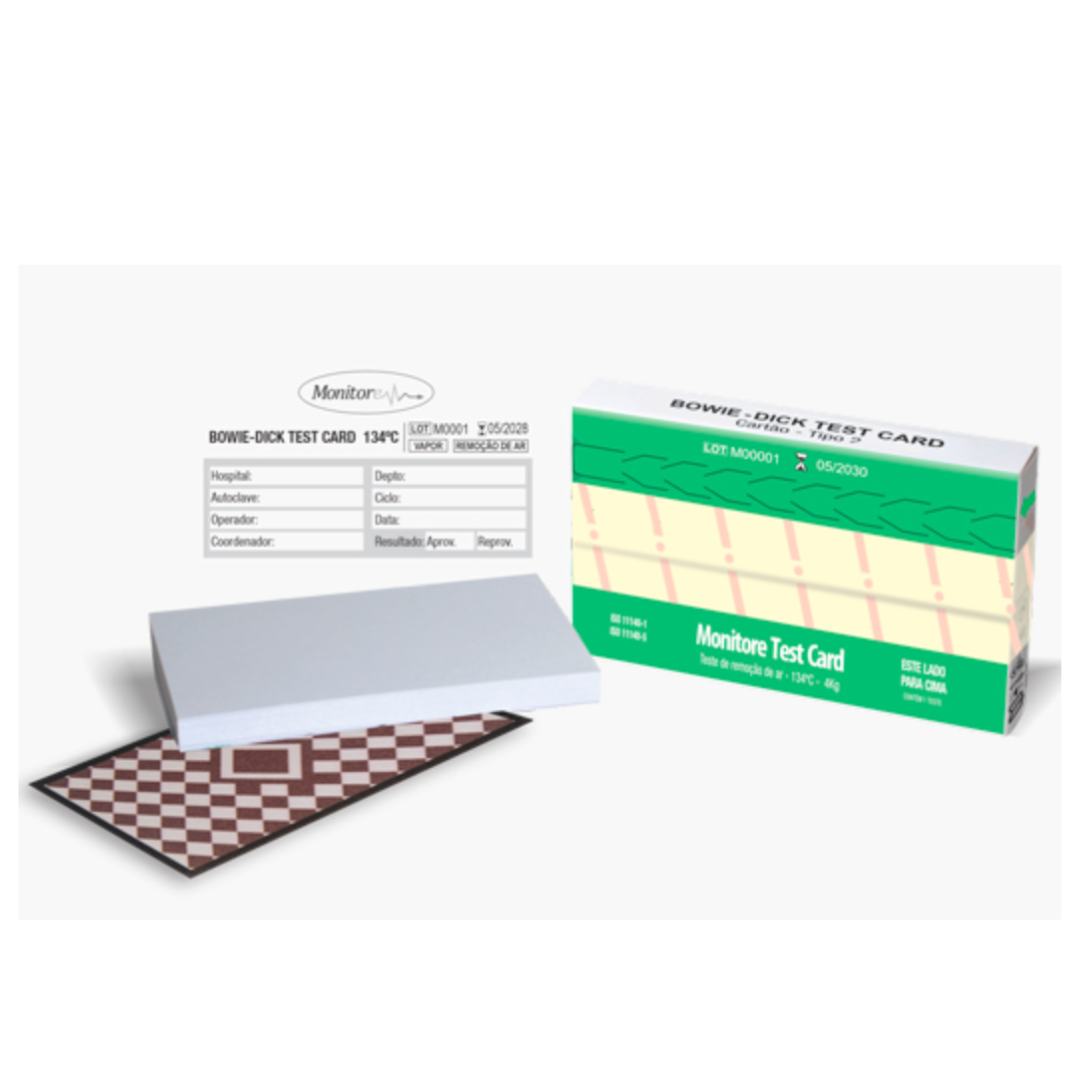 O Monitore Test Card é um teste Bowie Dick desenvolvido para o monitoramento diário de esterilizadores a vapor com pré-vácuo, permitindo identificar vazamentos de ar, penetração inadequada de vapor e falhas da bomba de vácuo.