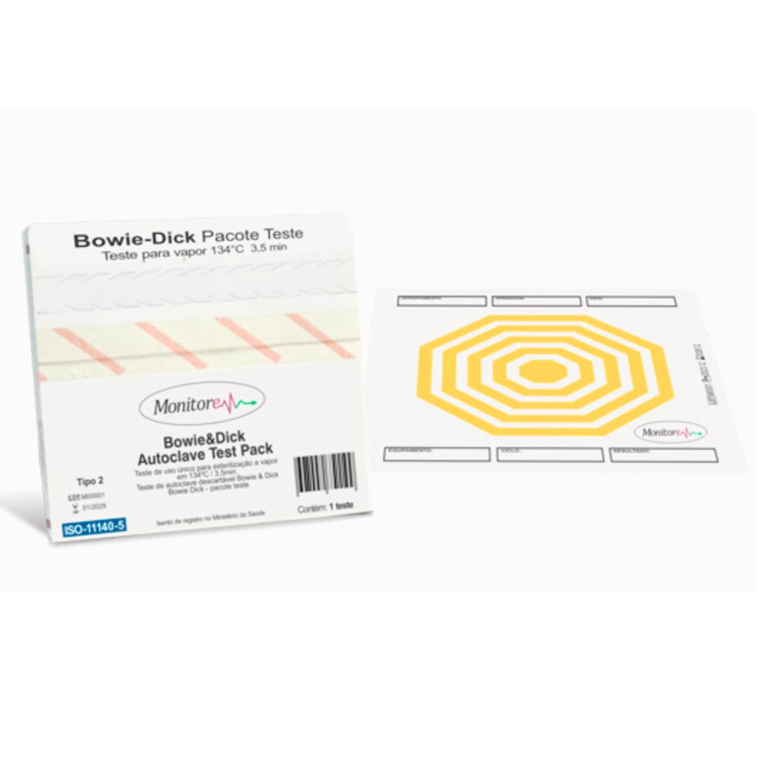 O pacote teste é de uso único e foi projetado conforme a norma ISO 11140-4. A folha teste possui tinta indicativa formulada para reagir à presença de vapor saturado, sendo altamente sensível à presença de ar residual e livre de metais pesados.